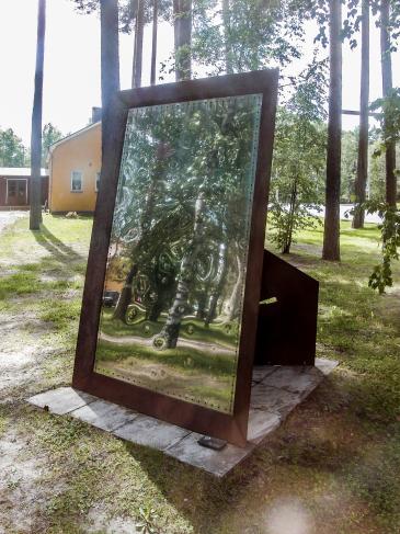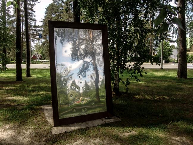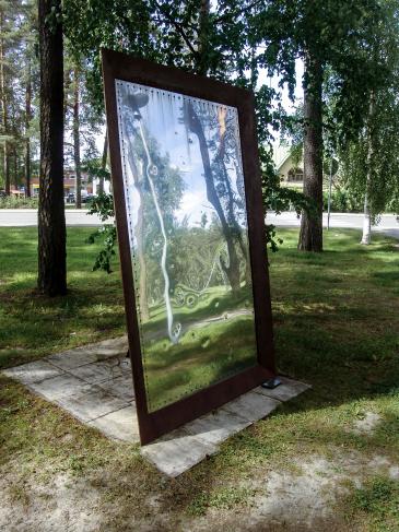 Jättiläiskokoinen valokuvakehys yhtäkkiä nurmikolla - kulttuurikorttelin puistossa. Valokuvapinnan sijasta teräksinen peilipinta heijastaa ja näyttää maiseman ja tietysti myös sopivasta kulmasta katsojan. Anne Alho tekee suuren eleen arkipäiväisen tutusta esineestä. Teatraalinen yllätysmittakaava pysäyttää katsojan - aivan kuin Lewis Carroll pysäyttää Liisan niin monesti ihmemaassa. Teoksen sileä peilipintaa kuvioivat kiveniskemät, aika on patinoinut kehyksiä. Ajan mukanaan tuoma kuluneisuus näkyy, mikä kertoo elämän kulusta: ei säästy ulkokuoremme ajan rattaissa . Sijainti: Keltaisen talon (Kankaanpään kaupungin palvelupisteen) takana, Kulttuurikorttelin puistossa, Jämintie 2